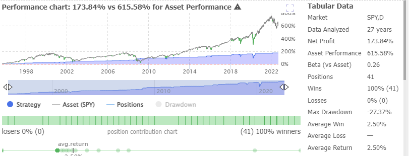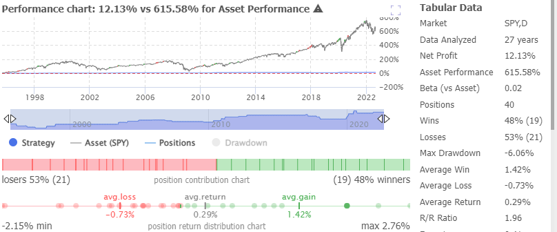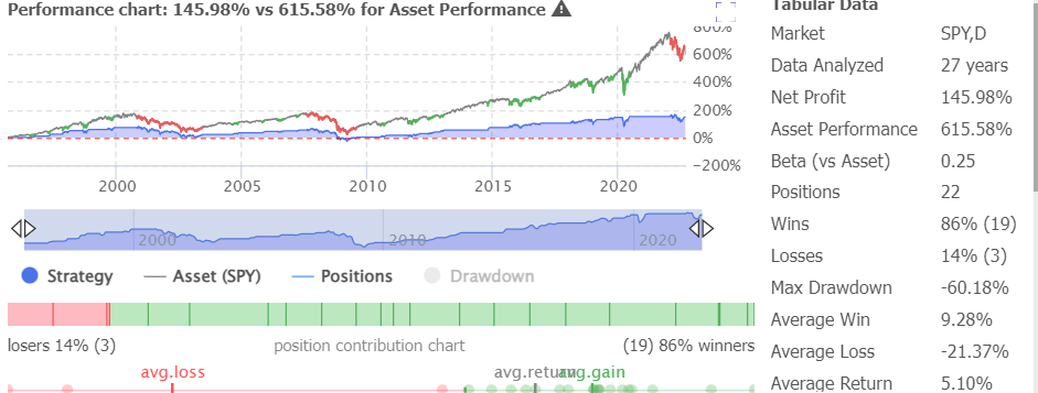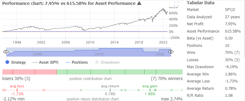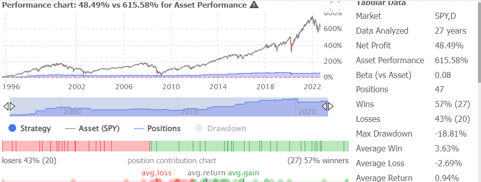 As you can see, the max drawdown was reduced to only 18.8%, but overall, the strategy still isn’t impressive. The overall returns are also low, at 48.5% over a 27-year period.
