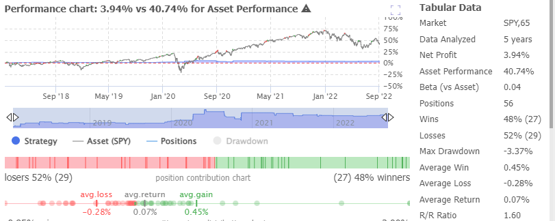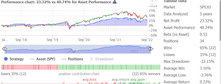 Using the 65-minute time frame for the same strategy also had positive results. Nonetheless, neither of these results are that impressive except for the very minimal drawdown.