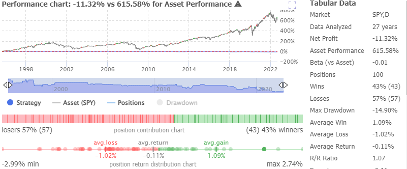 The strategy tested below simply only bought the SPY when its RSI reached 30 and only sold after it got to 70. As you can see below, it was profitable over a 27-year period, but it wasn’t all that great. It caught a max drawdown of over 60%, as it did horribly in the 2008-09 recession. Also, it had an average loss of 21% and only returned 146% vs 615.58% for buying and holding the SPY. The goal of trading is to minimize risk and maximize profits. This strategy didn’t seem to do that.