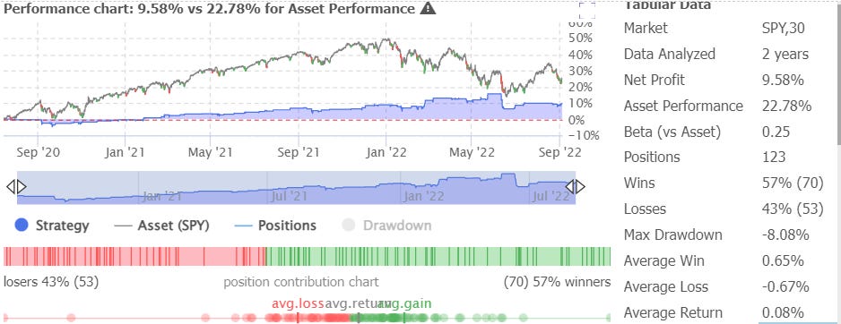 The same strategy on the 65-minute timeframe was no good and not worth showing. The 30-minute timeframe (shown below) is more impressive from a risk-reward standpoint, but it’s still nothing special. It may act as a decent low-volatility strategy at best, as its max drawdown was only 8% over the past two years.